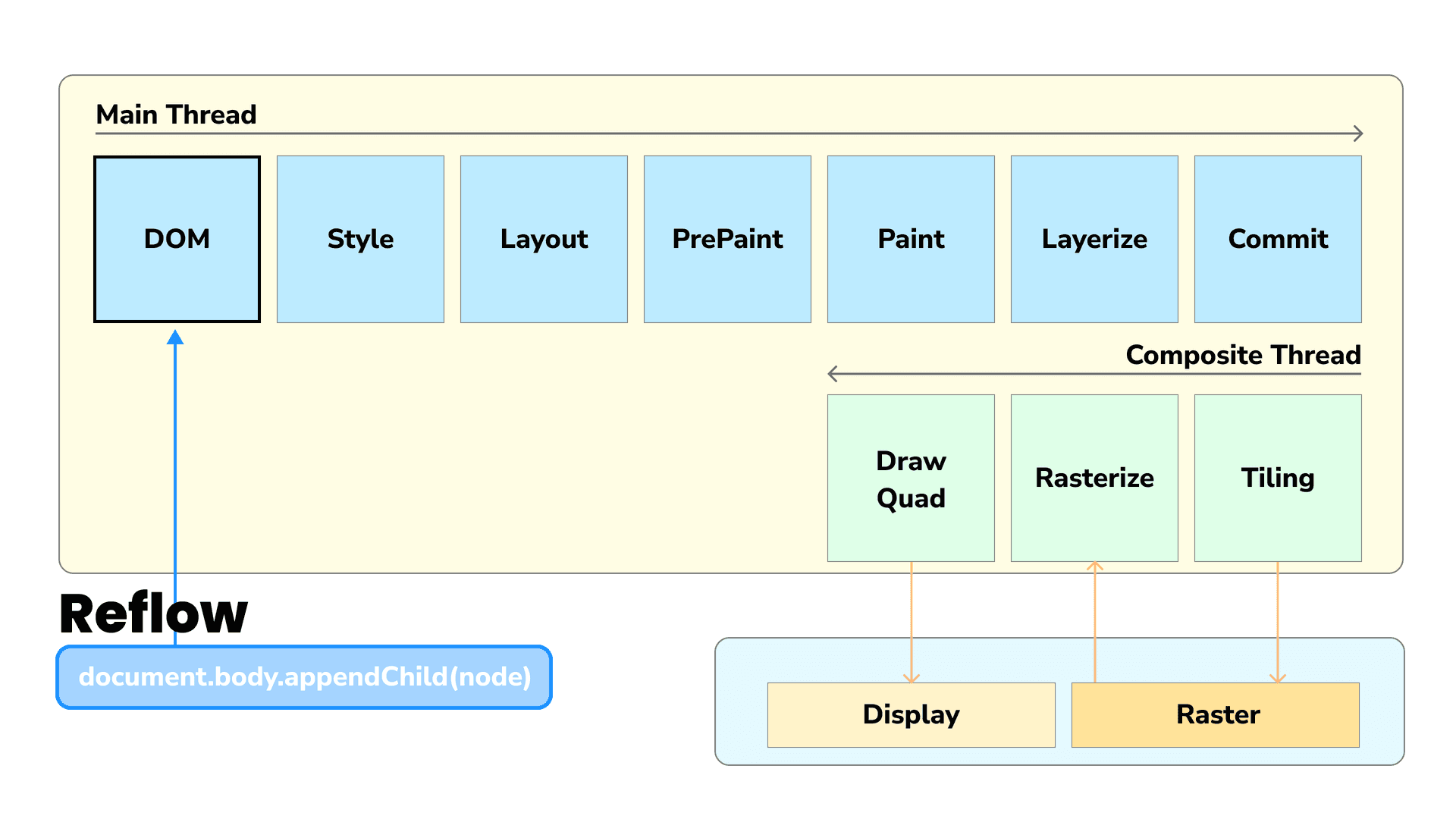 웹 성능을 결정하는 중요한 요소는 위의 다이어그램에서 보이는 Main Thread 점유 시간과 여부입니다. 첫 번째의 경우 DOM을 삽입하는 과정이 일어났기 때문에, 그리고 두 번째의 경우 DOM의 display