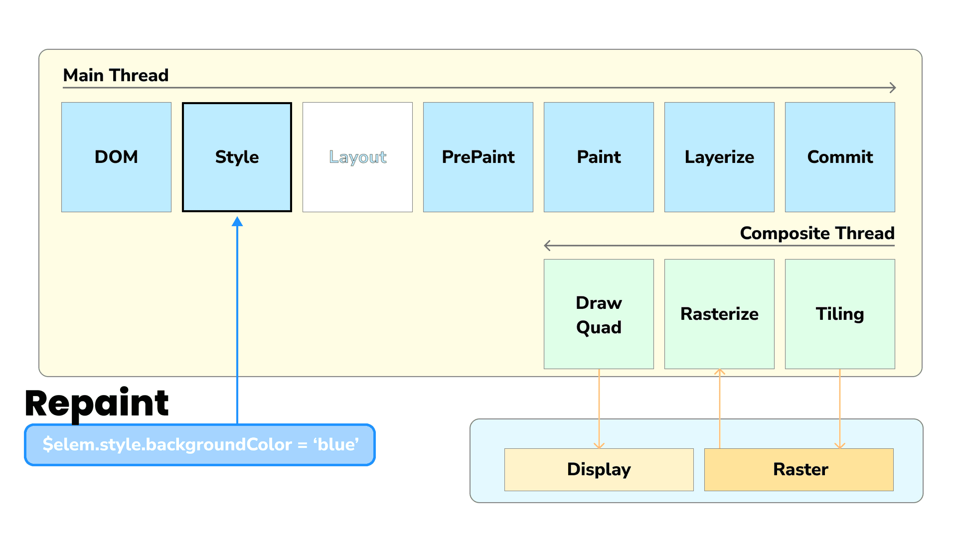 이 예시의 경우 Reflow 과정과 달리 Repaint 과정이 발생하면 Layout 단계는 수행하지 않고 건너뛰어 Paint 단계부터 수행합니다. 이렇게 Paint 단계부터 재실행되는 것을 Repaint라고 부릅니다.