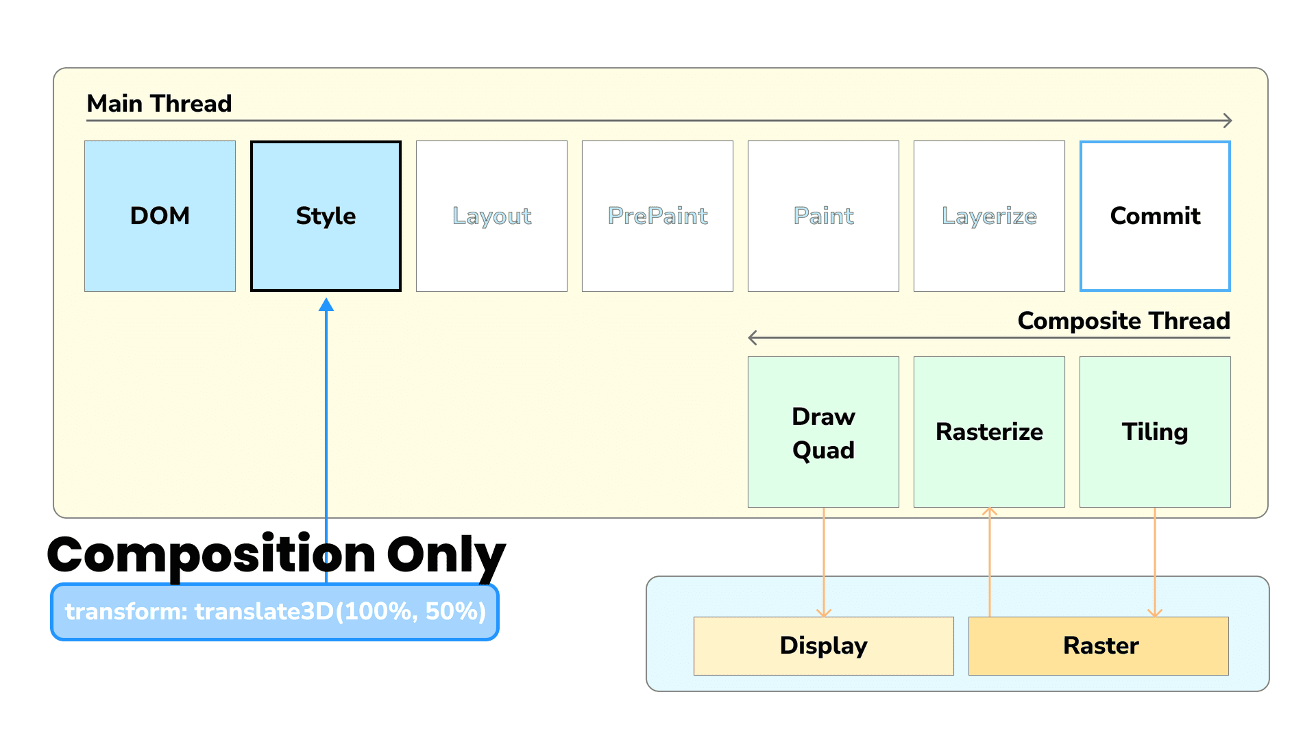 이 예시의 경우, Repaint 과정이 발생하면 첫 번째 경우와 달리 Layout 부터 Layerize 과정은 건너뛰고, 복사된 Commit 레이어를 사용하여 렌더링하므로 상대적으로 빠르게 동작한다고 볼 수 있습니다. 이 경우에 해당하는 과정을 Composition Only, 즉 합성이라고 부릅니다. transform